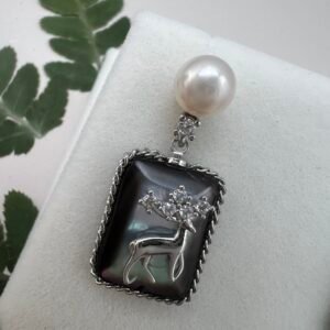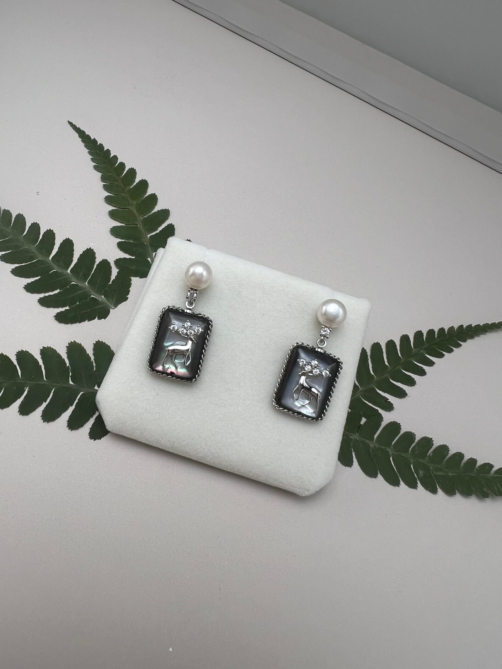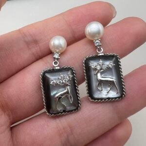 These drop earrings pair 7-8 mm natural freshwater pearls with iridescent black butterfly shell carved with a mystic deer, accented by tiny sparkling zircons. Made with gold-plated copper and hypoallergenic 925 sterling silver ear pins, they blend delicate elegance with an enchanting, mysterious charm.