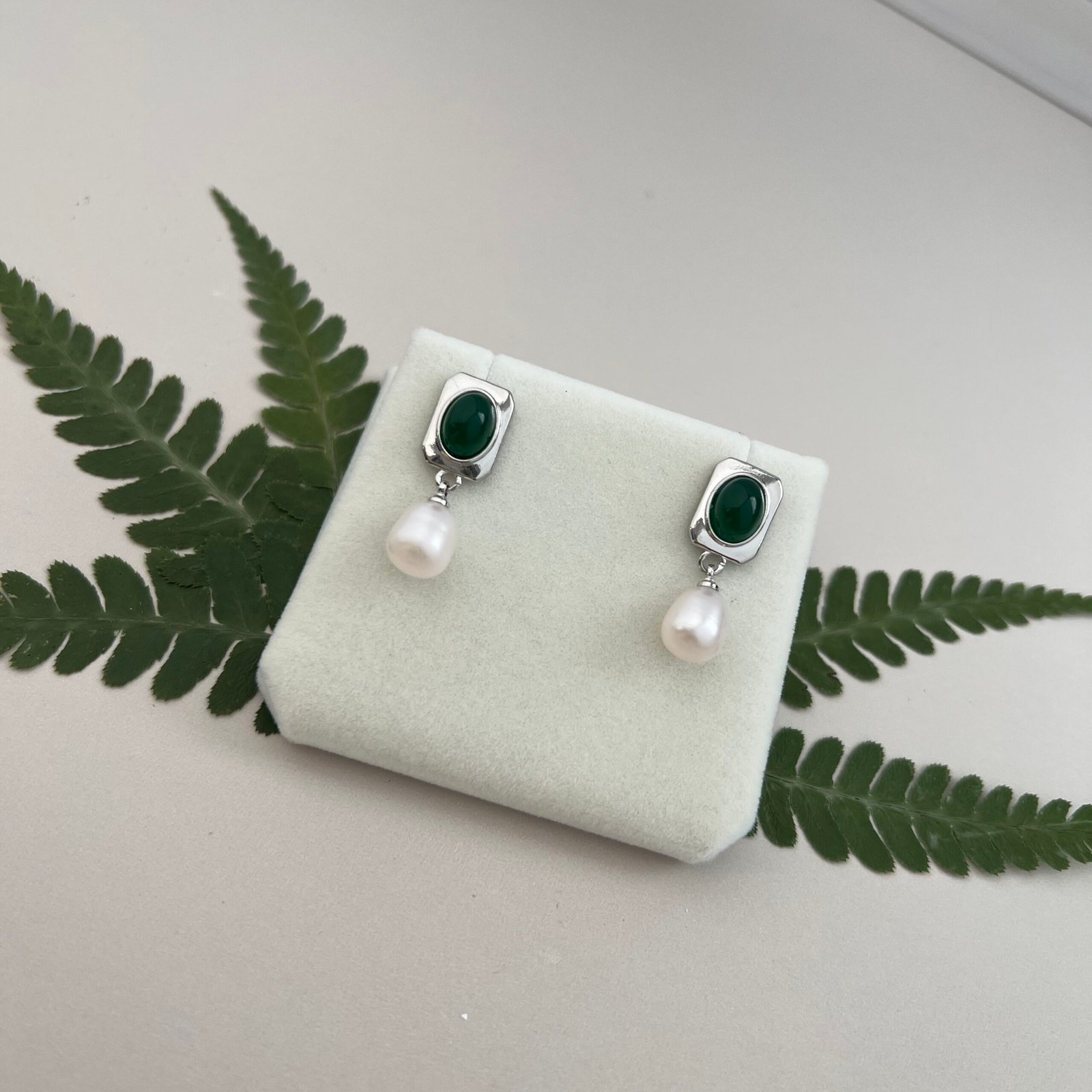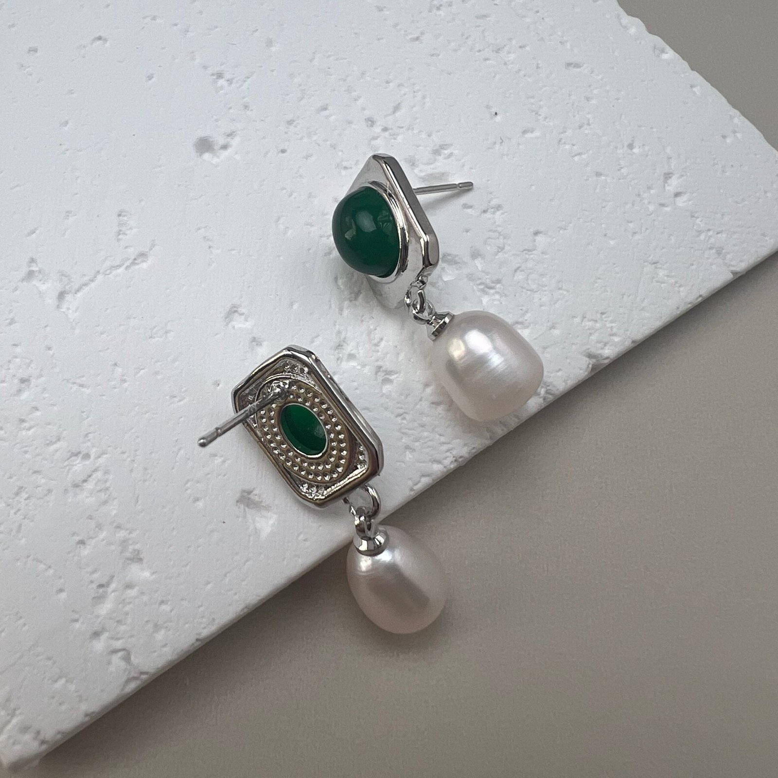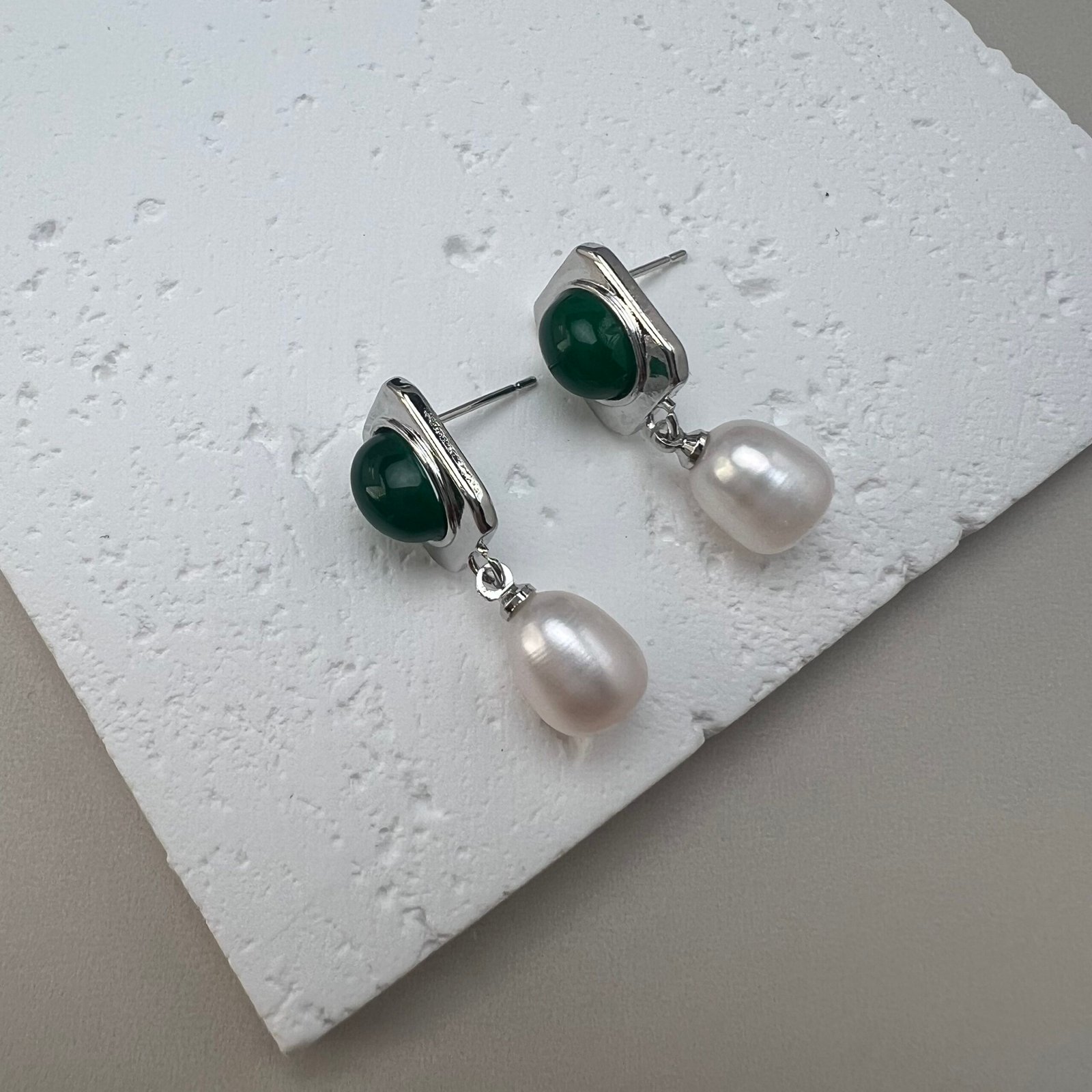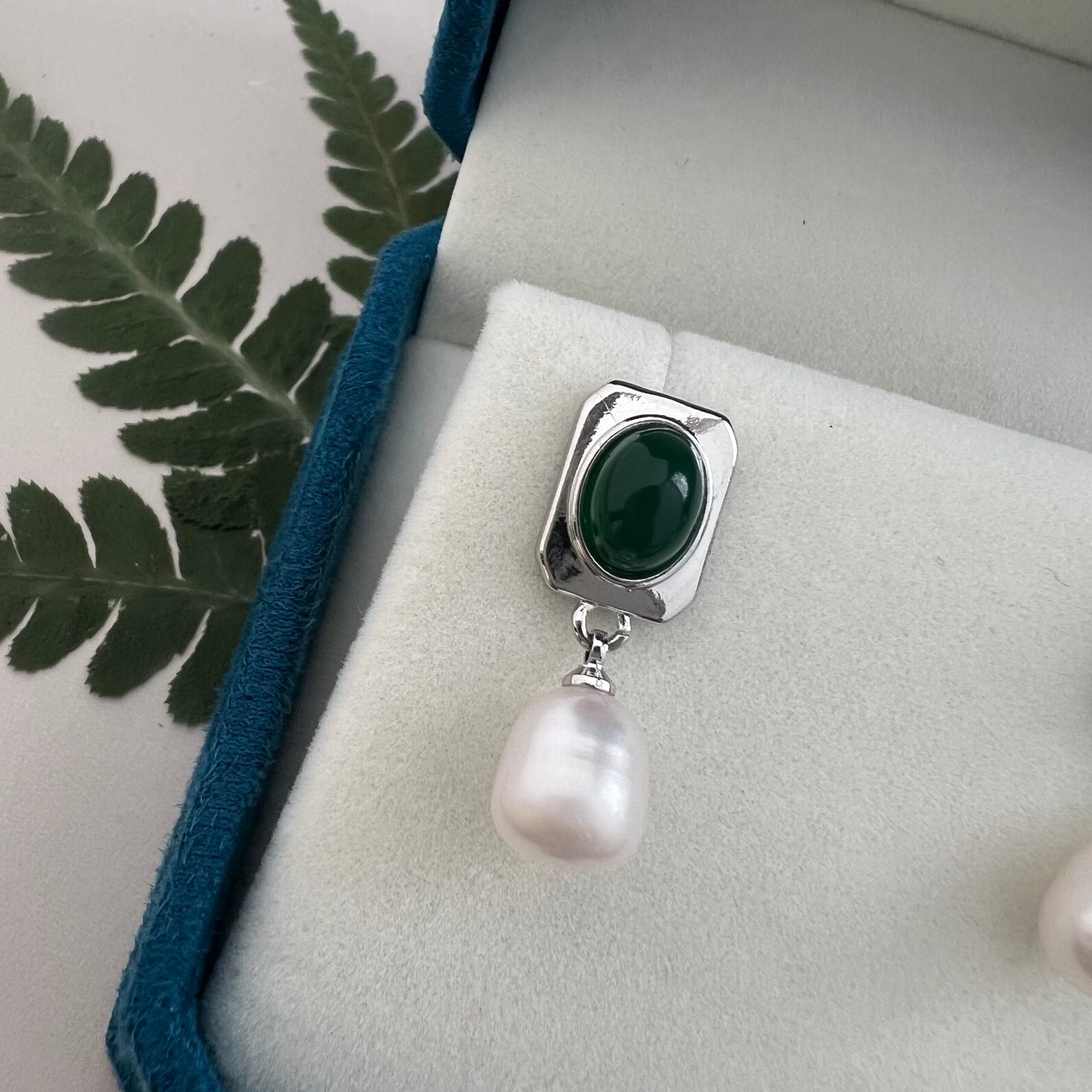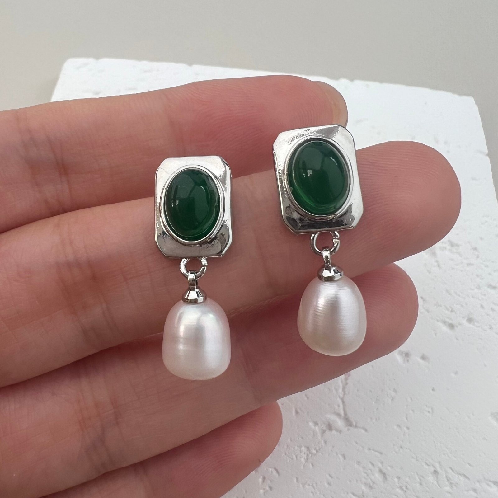 These dangle earrings feature an oval vintage green art glass inlay, paired with an 8 mm (width) natural teardrop freshwater pearl. Crafted from 18K gold-plated copper and hypoallergenic 925 sterling silver ear pins, the sleek geometric design blends retro elegance with understated luxury, making it a versatile piece for both daily wear and semi-formal occasions.
